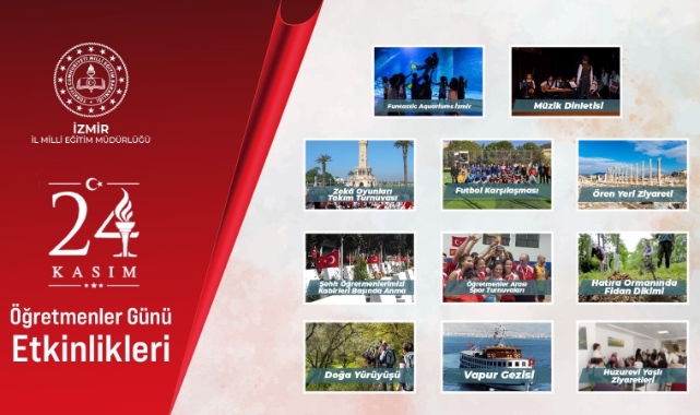 İzmir İl Milli Eğitim Müdürlüğü, 24 Kasım Öğretmenler Günü’nü hafta boyunca düzenlediği çeşitli etkinliklerle kutladı. İzmir genelindeki tüm öğretmenleri kapsayan programlarla dolu dolu bir hafta yaşatan İzmir İl Milli Eğitim Müdürlüğü, hem öğretmenlerin motivasyonunu artırdı hem de anlamlı etkinliklere imza attı.