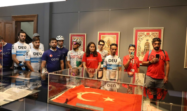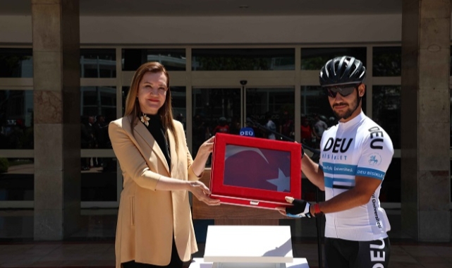 Dokuz Eylül Üniversitesi’nin (DEÜ) İzmir’in kurtuluşunun 100’üncü yıl dönümü etkinlikleri kapsamında düzenlediği ‘Al Bayrağımızla Geleceğe’ isimli bisiklet turuna katılan sporcular, DEÜ Rektörü Prof. Dr. Nükhet Hotar’dan emanet aldıkları şanlı Türk Bayrağını, Buca’daki DEÜ Bayrakbilim ve Türk Bayrakları Müzesine teslim etti. Rektör Hotar, “Dokuz Eylül Üniversitesi olarak varlık mücadelemizin simgelerini ve sembollerini asla unutmuyoruz. Her an ve her yerde 19 Mayıs ve 9 Eylül ruhunu yaşayan üniversite olarak, bu anlamlı etkinliği yapmaktan da gurur duyuyoruz” diye konuştu.