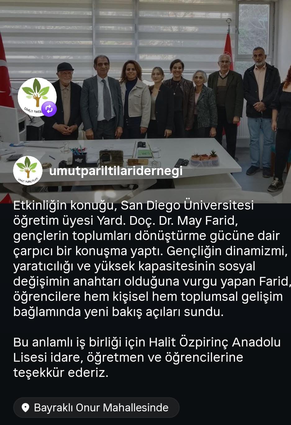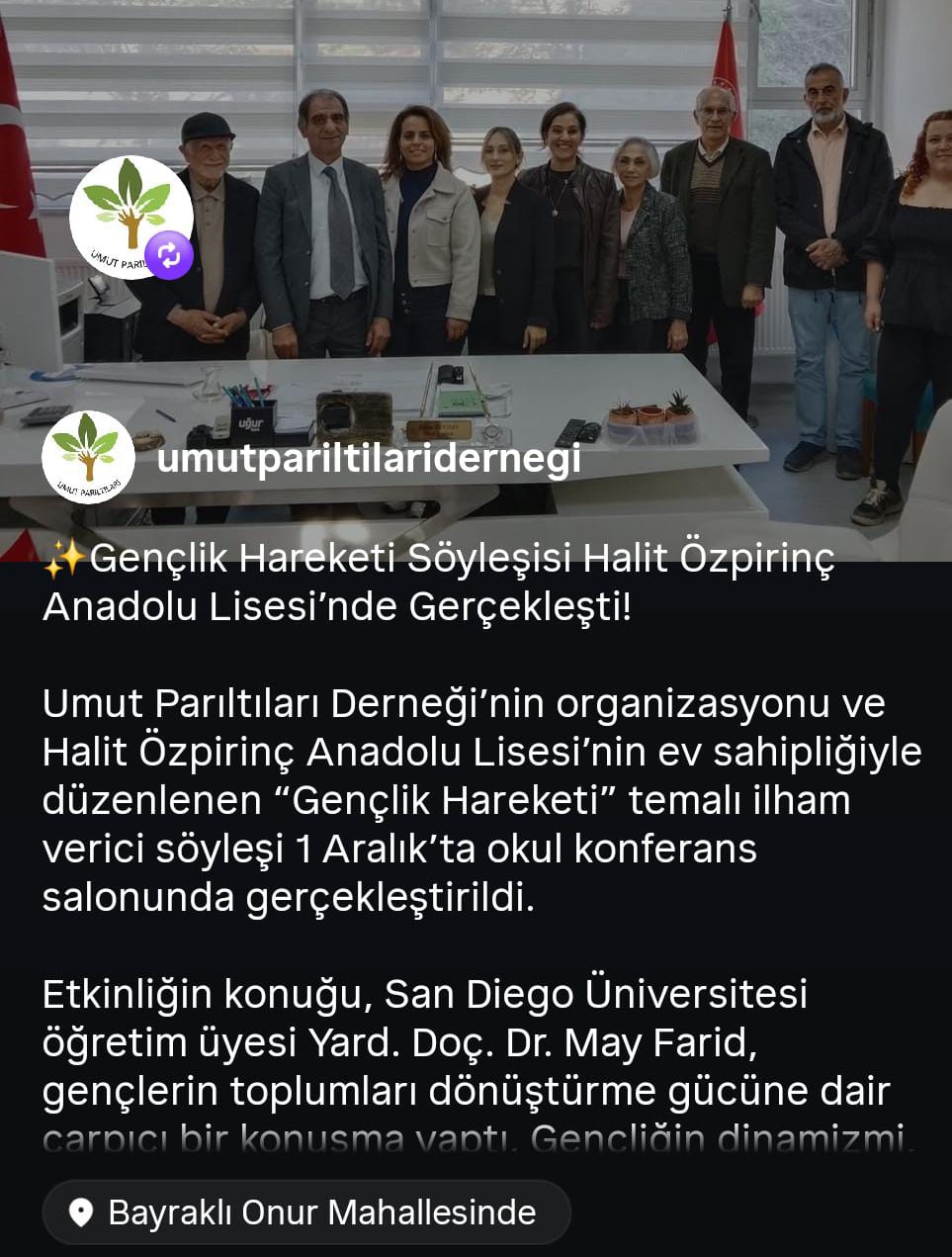 halit_ozpirincanadolulisesi resmi instagram sayfasında Aynen şu şekilde yapılan etkinlik anlatılmış: Bugün okulumuzda San Diego üniversitesi öğretim üyesi sayin prof.May Farid'i misafir ettik May Farid öğrencilerimiz ile gençlerin toplumu harekete geçirme, özgüven kazanma ve kendi varlıklarının bilincinde olma konularinda öğrencilerimiz ile söyleşi yaptı. Çok farklı bir konseptte geçen konuşmada bizlere Avusturyalı, çin, Amerika, uyruklu eğitimciler eşlik etti ayrıca Çin'de özel bir okulu olan katılımcılarımız gençler ile tanışma fırsatı buldular. Hepsine çok teşekkür ederim. Bu konuşma için umut pariltilari dernegine de sonsuz teşekkürlerimizi sunuyoruz. umutpariltilaridernegi Peki okul İdaresi bu etkinliğe velilerden izin almadan öğrencileri teşvik ediyor ve bu etkinliği öve öve sosyal medyasında paylaşıyor madem bu kadar övülecek bir etkinlik neden silmek gereği hissediyor. Valilikt Kaymakamlıkta İl ve İlçe Milli Eğitim Müdürlüğünden izin alınmamış Biz velilere bilgi verilmemiş.