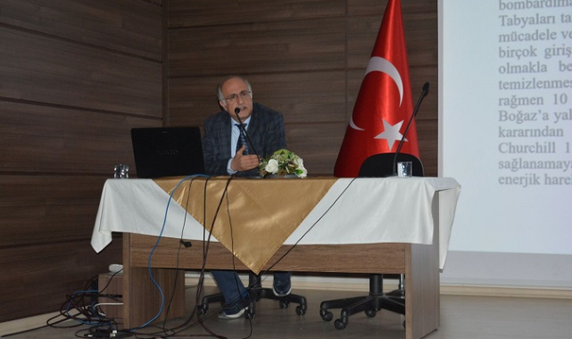 İZMİR(Ege Ajans)- Ege Üniversitesi (EÜ) 70. Kuruluş Yıldönümü Etkinlikleri kapsamında “18 Mart 1915 İtilaf Donanması’nın Kara Günü” başlıklı konferans düzenlendi. EÜ Edebiyat Fakültesi Prof. Dr. Nuri Bilgin Konferans Salonunda düzenlenen etkinlikte Edebiyat Fakültesi Tarih Bölümü Başkanı Prof. Dr. Nuri Karakaş, konuşmacı olarak yer aldı. Konferansa; EÜ Edebiyat Fakültesi Dekan Yardımcısı Dr. Öğr. Üyesi Semih Çınar, Atatürk İlkeleri ve İnkılap Tarihi Uygulama ve Araştırma Merkezi Müdürü Prof. Dr. Cihan Özgün, akademisyenler ve öğrenciler katıldı.