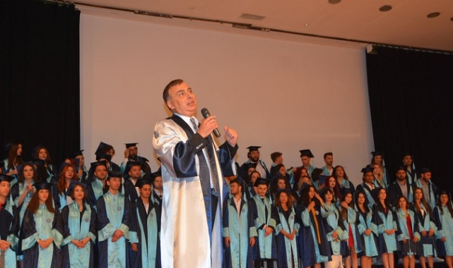 Mezunlara seslenen Prof. Dr. Atılgan, “Değerli mezunlarımız, sizler kimi zaman zorlu ve kimi zaman keyifli geçen bir yolculuğun artık sonuna geldiniz. Hatta bu yolculuğun son dönemini tüm dünyayı etkisi altına alan, eğitim sistemini ekranlara hapseden Covid-19 salgın süreciyle geçirdiniz. Ülkemizin en köklü ve en iyi üniversitelerinden olan Ege Üniversitesinin Çeşme Turizm Fakültesinden genç turizmciler olarak mezun oluyorsunuz. Ailemize katıldığınız ilk güne göre bugün daha olgun, donanımlı, evrensel değerler özümsemiş ve bilimin ışığını takip eden bireyler olarak fakültemizden ayrılıyorsunuz. Artık hayatınız boyunca EÜ Ailesinin birer mensubusunuz. Kalitesi tescillenmiş, Araştırma üniversitesi etiketine sahip bir üniversiteden mezun oluyorsunuz. Mezunlarımızın EÜ ailesinin birer ferdi olarak, üniversitemizi her alanda en güçlü şekilde temsil edeceğinize inancımız tamdır ” diye konuştu.