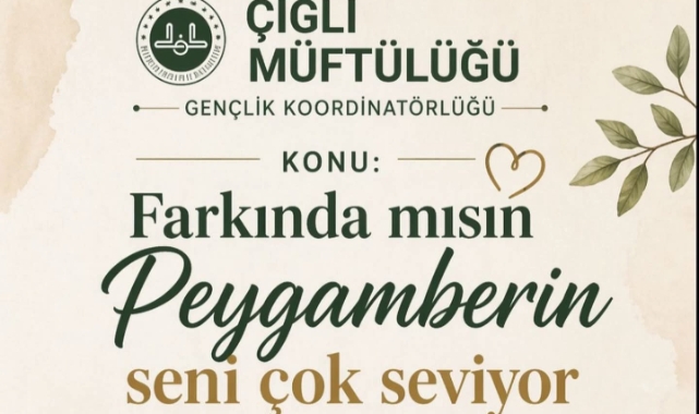 Çiğli Müftülüğü’nden Anlamlı Seminer: “Farkında mısın, Peygamberin seni çok seviyor”Çiğli Müftülüğü Gençlik Koordinatörlüğü tarafından düzenlenecek “Farkında mısın, Peygamberin seni çok seviyor” konulu seminer Eğitimci Yazar Ravza Zeybek tarafından 24 Nisan 2026 günü saat 17.00 de Fatih Camiinde gerçekleşecek.