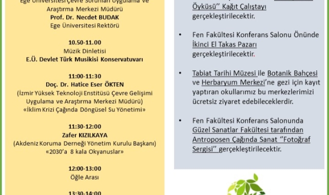 Sunshine Coast Üniversitesi Çevre Mikrobiyolojisi Kıdemli Öğretim Üyesi Dr. İpek Kurtböke, “Çevre Dostu Gelecekler için Mikrobiyal Kaynaklar” konusunda, Muğla Sıtkı Koçman Üniversitesi Atık Yönetimi Koordinatörü Doç. Dr. Çağdaş Gönen ise “İklim Değişikliği Perspektifinde Tüketim ve Atık Yönetimi” sunumlar gerçekleştirecek. Panelde Dünya Çevre günü aktiviteleri kapsamında Emel Akın Meslek Yüksekokulu Öğr. Gör. Şükran Tümer’in yönetiminde “Dönüşümün Öyküsü Kağıt Çalıştayı” ve İkinci El Takas Pazarı etkinliği düzenlenecek. Ayrıca Fen Fakültesi Konferans Salonunda Güzel Sanatlar, Tasarım ve Mimarlık Fakültesi tarafından “Antroposen Çağında Sanat” adlı fotoğraf sergisi yer alacak.