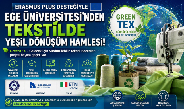 # Ege Üniversitesi GreenTEX# sürdürülebilir tekstil# Erasmus Plus proje# yeşil dönüşüm tekstil# döngüsel ekonomi tekstil# İzmir üniversite projeleri# çevre dostu üretim# tekstil sektörü dönüşüm# Avrupa Birliği projeleri# upcycle tekstil