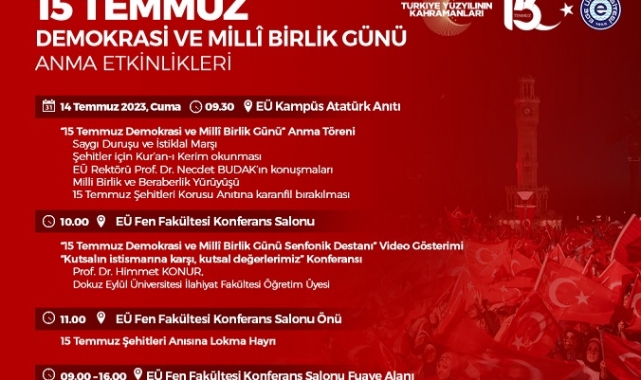 Etkinlikler, Fen Fakültesi Konferans Salonunda, Dokuz Eylül Üniversitesi İlahiyat Fakültesi Öğretim Üyesi Prof. Dr. Himmet Konur’un konuşmacı olarak yer alacağı, “Kutsalın İstismarına Karşı, Kutsal Değerlerimiz” başlıklı konferansla devam edecek. Konferans öncesinde “15 Temmuz Demokrasi ve Milli Birlik Günü Senfonik Destanı” video gösterimi yapılacak.
