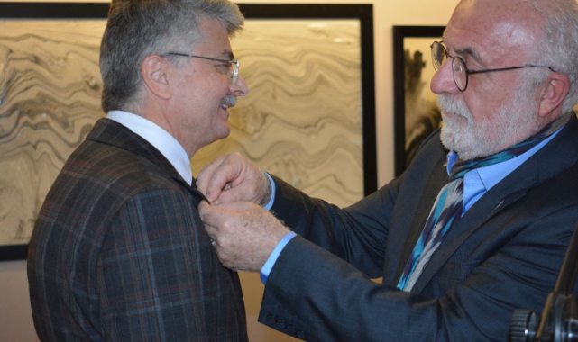 Konuşmaların ardından Rektör Yardımcısı Prof. Dr. Mehmet Ersan, EgeArt’a katkılarından ötürü Hikmet Barutçugil’e “Teşekkür Belgesi” takdim etti. Hikmet Barutçugil ise Ebristan Sanat Evi’nin sembolü olan gümüş lale rozetlerini Prof. Dr. Mehmet Ersan’ın, SKS Daire Başkanı Aysel Ildızlı’nın ve sergiye katkı sunan Alper Akdeniz’in yakalarına taktı. Sergi kapsamında katılımcılar, ney dinletisi eşliğinde eserleri incelediler.
