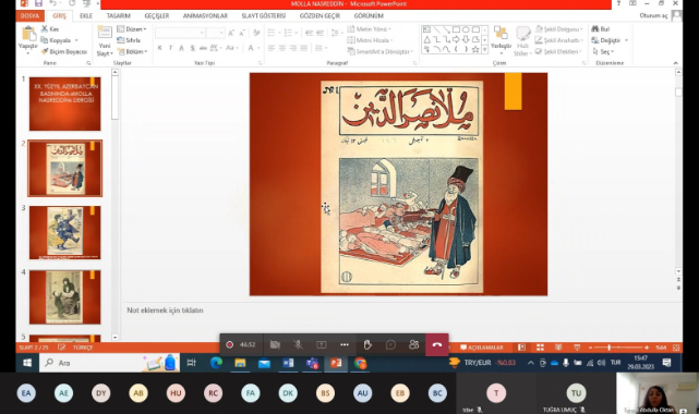 Etkinlikte, Azerbaycan edebiyatında önemli bir yere sahip olan Molla Nasreddin Dergisi’nin tarihsel süreci hakkında bilgi veren Dr. Tarana Oktan, “19. yüzyılın sonunda Azerbaycan topraklarında petrol bulunmasıyla beraber Rusya’nın bu bölgeye yatırımlarının arttığı bir süreç bulunuyor. Söz konusu süreçte oluşan Azerbaycan burjuva sınıfı, çeşitli yayınlar çıkarıyor. Başarısız olan bu yayınların ardından, 1906 yılında Celil Memmedguluzade tarafından Tiflis’te ilk kez bir hiciv dergisi çıkarılıyor. Molla Nasreddin, yayın hayatına başarılı bir şekilde devam ederken 1929 yılında Sovyetler Birliği baskısı nedeniyle adını değiştirmek zorunda kalıyor. Bu süreçten sonra eski niteliğini kaybeden dergi, 6 sayı sonra kapanıyor” dedi.
