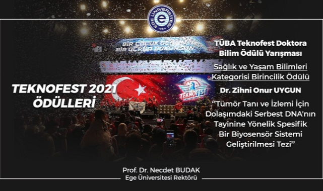 TEKNOFEST kapsamında düzenlenen TÜBA Doktora Bilim Ödüllerinde Ege Üniversitesi Sağlık Bilimleri Enstitüsünde görevli Dr. Zihni Onur Uygun’un “Tümör Tanı ve İzlemi İçin Dolaşımdaki Serbest DNA'nın Tayinine Yönelik Spesifik Bir Biyosensör Sistemi Geliştirilmesi” tezi, Sağlık ve Yaşam Bilimleri alanında birinciliği etti. Dr. Gülşah Çongur’un Ege Üniversitesinde hazırladığı “Biyomoleküler Etkileşimi Elektrokimyasal Algılamaya Yönelik DNA Biyosensörlerinin Geliştirilmesi” başlıklı tezi ise aynı kategoride ikinci oldu. Üniversite Öğrencileri Araştırma Proje Yarışmalarında Egeli öğrenciler Sena Yanışık ve Bensu Yağmur Arslan’ın hazırladığı “Oral Yolla Alınan İlacın Karaciğer Tümörüne Hedeflendirilmesinin Modellemesi ve 3b Sferoid Temelli Çip-Üstü-Karaciğer Platformu ile Validasyonu” projesi sağlık alanında üçüncülük ödülüne layık görüldü.