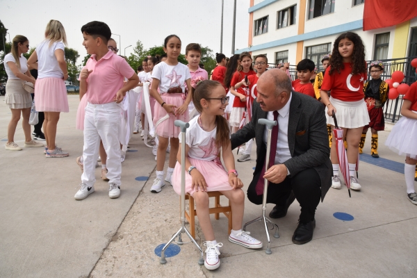 Serebral palsi hastası 3 A Ela Elif Yıldızkaya’nın karnesini İlçe Milli Eğitim Müdürü Kadir Kadıoğlu verdi. Ela Elif Yıldızkaya’nın 3A sınıfının gösterisinde yer alması etkinliğe katılanlardan büyük alkış aldı.
