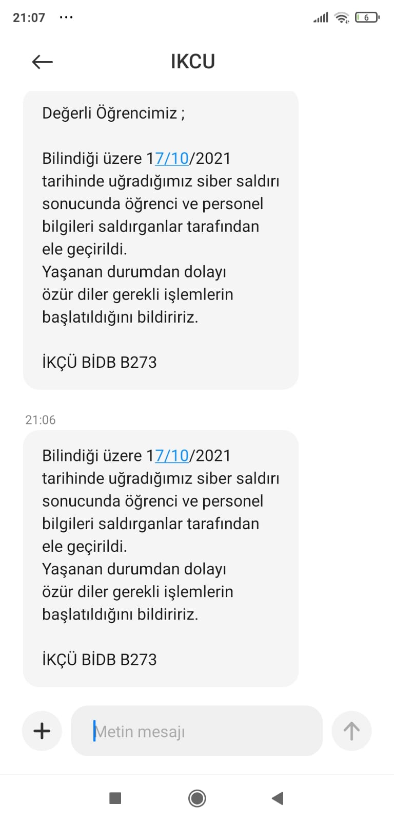 İzmir Kâtip Çelebi Üniversitesi, öğrencilerine ve personeline gönderdiği bilgilendirme mesajında siber saldırı sonucunda öğrenci ve personel bilgilerinin ele geçirildiğini açıkladı. Üniversite, öğrencilerinden ve personelinden yaşanan durumdan dolayı özür dileyerek gerekli işlemlerin başlatıldığını açıkladı. Üniversite öğrencilerine ve personelinin bilgileri, ilk olarak 14 Ekim tarihinde bir hacker forum sitesinde gözükmüştü.