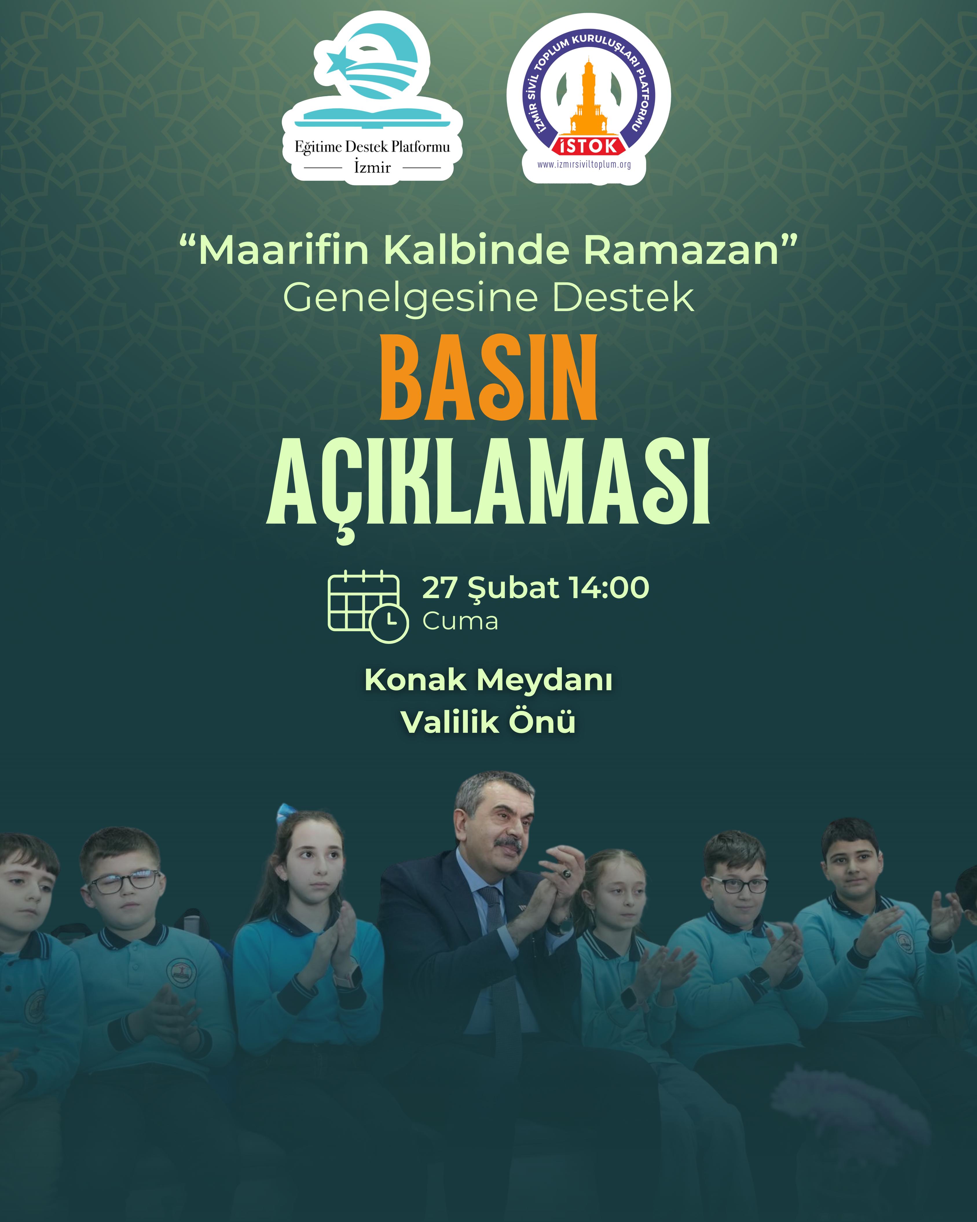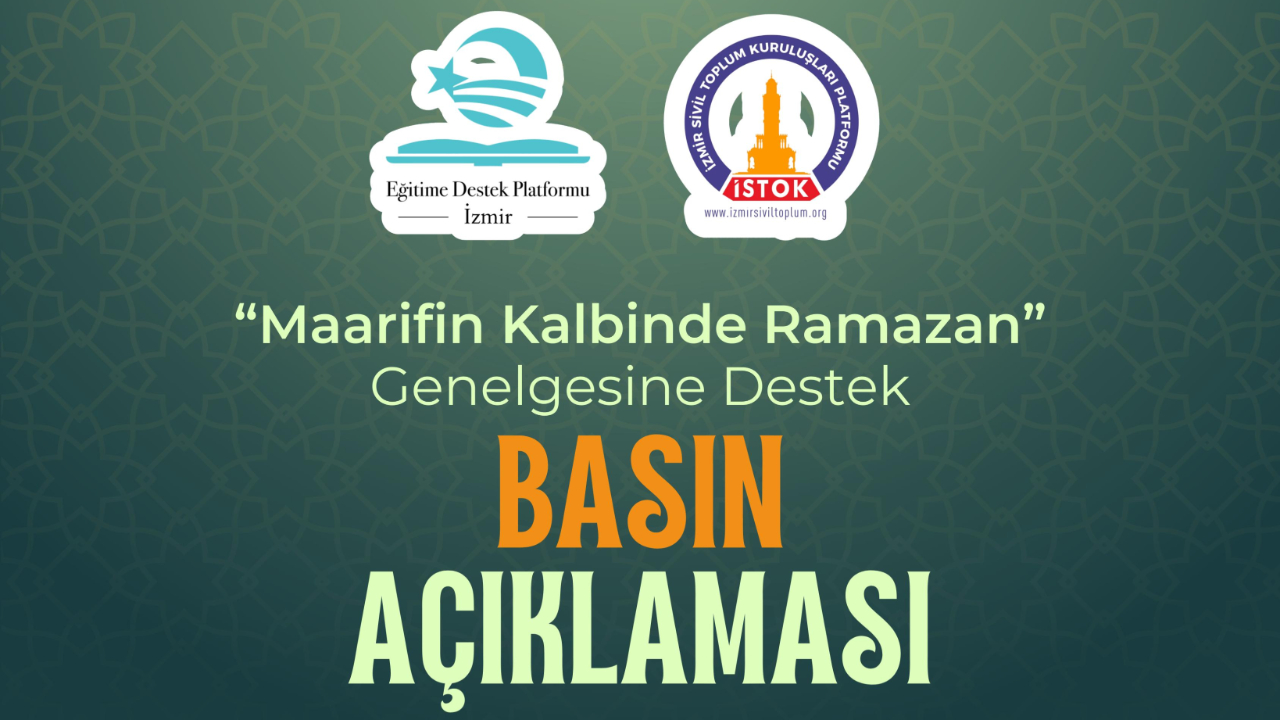 “Maarifin Kalbinde Ramazan” Etkinliklerine İzmirli STK’lardan Tam DestekDeğerli Kamuoyu,Öncelikle başı rahmet, ortası mağfiret, sonu ise cehennem azabından kurtuluş olan mübarek Ramazan-ı Şerif’in hayırlara vesile olmasını diliyor; sizleri saygı, sevgi ve muhabbetle selamlıyoruz.