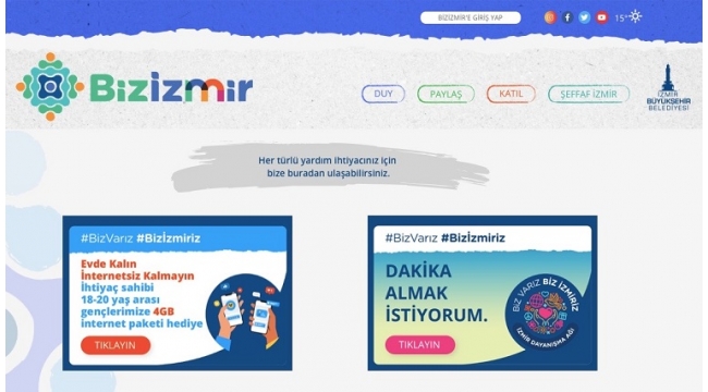 İzmir Büyükşehir Belediyesi koronavirüsle mücadele önlemleri kapsamında sokağa çıkma yasağına takılan 20 yaş altındaki gençlere bir aylık internet paketi hediye ediyor. Desteklenmesi gereken gençler 4 GB’lık bu paket için başvurularını Bizİzmir dijital platformlarından yapabiliyor. Kampanyayı geçen günlerde İzmir Büyükşehir Belediye Başkanı Tunç Soyer, sosyal medya hesaplarından şöyle duyurmuştu: “Gençler, biliyorum size verilecek en güzel hediye, yeniden sokaklara çıkmanız olacak. Kısıtlılık sürecinde dünyadan kopmamanız için 18-20 yaş arası, desteğe ihtiyaç duyan gençlere 4 GB internet paketi geliyor. Şimdilik elimizden gelen bu.”