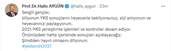 Ölçme, Seçme ve yerleştirme Merkezi (ÖSYM) Başkanı Prof. Dr. Halis Aygün, Twitter hesabından yaptığı paylaşımda, "Sevgili gençler, biliyorum yks sonuçlarını heyecanla bekliyorsunuz, sizi anlıyorum ve heyecanınızı paylaşıyorum. 2021-YKS yerleştirme işlemleri ve kontroller devam ediyor. Önümüzdeki hafta içerisinde sonuçları açıklayacağız. Şimdiden hayırlı olmasını diliyorum." ifadelerini kullandı.