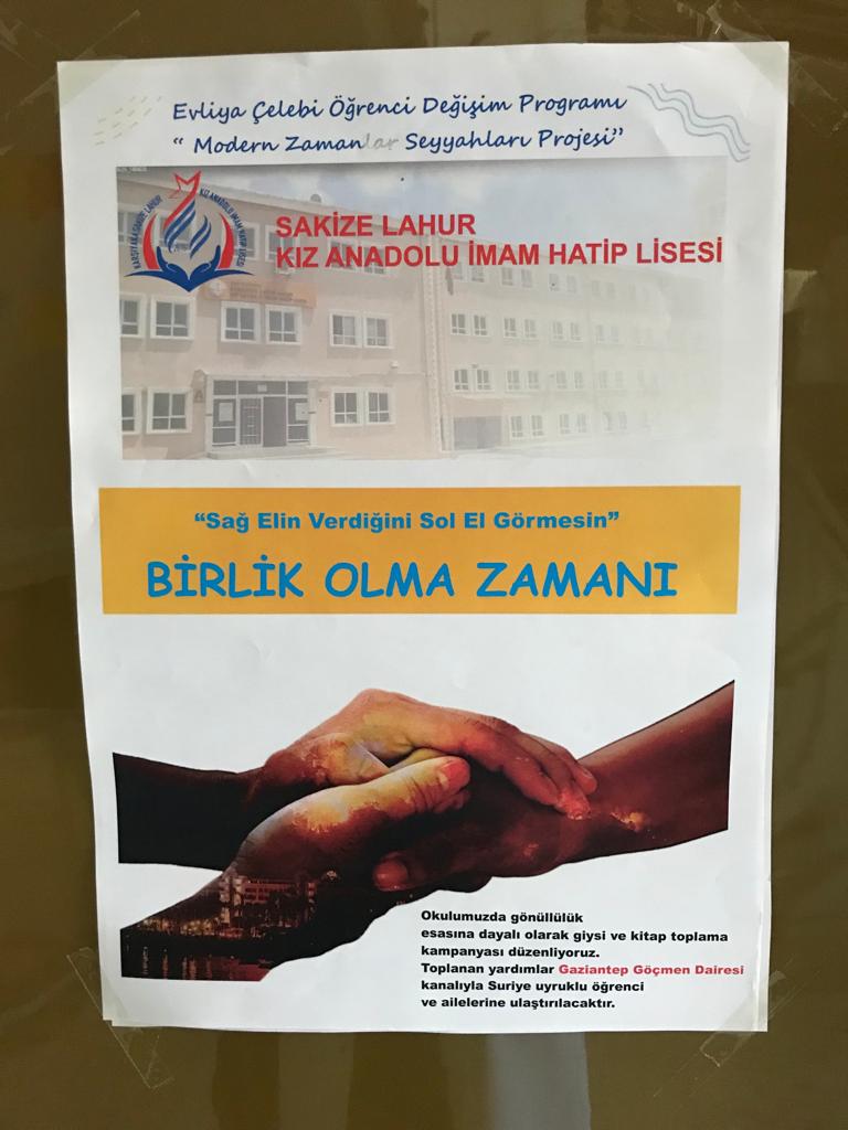 Proje kapsamında 14- 21 Mayıs 2022 ‘de dokuz öğrenci Gaziantep’te Saçaklı Adil Özberk Kız Anadolu İmam Hatip Lisesi öğrencileriyle birlikte ortak derslerde bir arada bulunarak tanışıp kaynaştılar. Okul Müdürü Serap OVACIKLI tarafından Sezai Karakoç yılı vesilesi ile paydaş okul öğrencilerine “Sezai Karakoç’un fikir dünyası ve eserlerinde sosyal konular” konulu bir seminer verildi ve iki okul öğrencilerinin ortak katılımıyla Sezai Karakoç Şiir Dinletisi gerçekleştirildi. Etkinliğimize Eğitim Uzmanı Dr. Sefika Mutlu ve İl Mem Sube Müdürümüz Dr. Yusuf Yılmaz katıldı.. Toplumsal sorumluluk ve gönüllülük faaliyeti olarak gezi öncesinde düzenledikleri yardım kampanyasında toplanan giysi ve kitapları paydaş okulda çok sayıda bulunan ve ekonomik durumları iyi olmayan Suriye uyruklu öğrencilere ulaştırıldılar. Voleybol Maçı yapan öğrenciler Gaziantepli arkadaşlarıyla aralarındaki dostluk ve kardeşlik duygularını pekiştirdiler. Gaziantep ilinde bulunan Zeugma Mozaik Müzesi, Bayazhan Gaziantep Kent Müzesi, Gaziantep Savaş Müzesi , Panorama 25 Aralık Müzesi, Hasan Süzer Etnoğrafya Müzeleri, Tarihi Hamam Müzesi, Mutfak Sanatları Müzesi, Oyuncak Müzesi, Gaziantep Kalesi, Bakırcılar Çarşısı, Botanik Bahçesi, Hayvanat Bahçesi ile Tarihi Antep Evlerini gezerek Gaziantep ilinin tarihi ve kültürel yapısını görerek, yaşayarak öğrendiler. Yaptıkları gözlemler neticesinde, hazırlanan Evliya Çelebi Seyehatnamesi için gezi yazıları yazdılar. Ayrıca Gaziantep mutfağına ait lezzetleri tatma imkanı buldular.