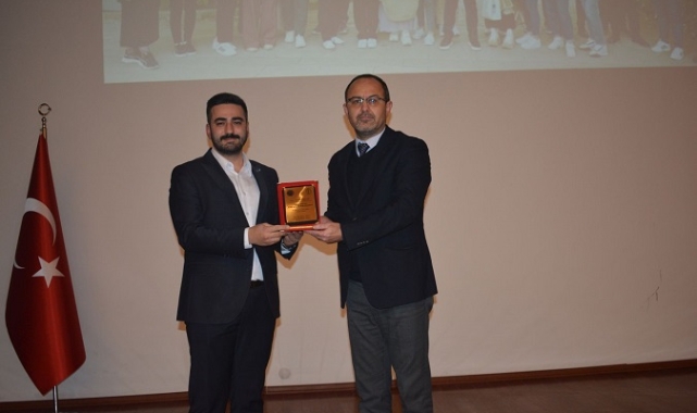Söyleşi sonunda Prof. Dr. Dinçer Ayaz tarafından katılımlarından dolayı Batuhan Yeşilyurt’a günün anısına “Teşekkür Plaketi” verildi.