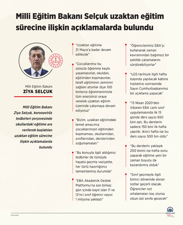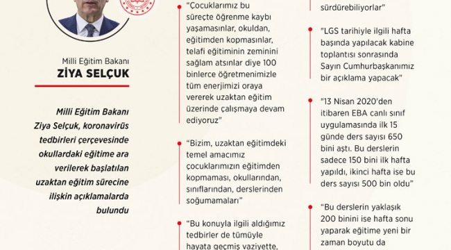 "Çalışmalarımızı bu perspektifle en ince ayrıntısına kadar planlıyoruz. Salgının başladığı tarihten itibaren dünya ülkelerinin birçoğundan daha kısa sürede uzaktan eğitime geçme kararı almış olmanın da faydalarını şimdiden görüyoruz. Bilim Kurulunun tavsiyeleri doğrultusunda ve Sayın Cumhurbaşkanımızın öncülüğünde kabine toplantısında ortaya çıkan görüşler çerçevesinde uzaktan eğitimin 31 Mayıs'a kadar devam etmesi kararlaştırılmıştır. Şu an çocuklarımızın en güvende olacakları yer evleri. Hepimizin elden bırakmayacağı yegane şey tedbir ve birbirimize göstereceğimiz sabır, anlayış ve dikkat. Süreç uzadıkça motivasyonun düşebileceğini, sıkılmaların olabileceğini tahmin edebiliyoruz. Bir an önce normalleşme adımlarını atabilmemiz, okullarımızı sağlıkla açabilmemiz, eskisi gibi okul bahçelerinde koşup, sınıflarda gülebilmemiz için bu süreci hep birlikte yönetmek durumundayız."