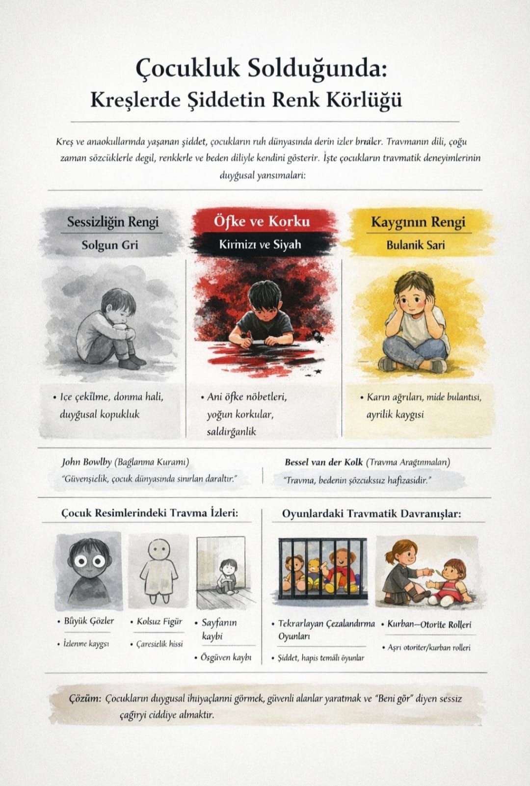Şiddete maruz kalan çocuk çoğu zaman bağırmaz. Aksine sessizleşir. Oyun durur, hayal gücü daralır, bakışlar boşlukta gezinir. John Bowlby’nin bağlanma kuramı, bu geri çekilmeyi bir kopuş olarak değil, çocuğun kendini koruma biçimi olarak tanımlar. Dünya güvenilir olmaktan çıktığında, çocuk da dünyayla arasına mesafe koyar.