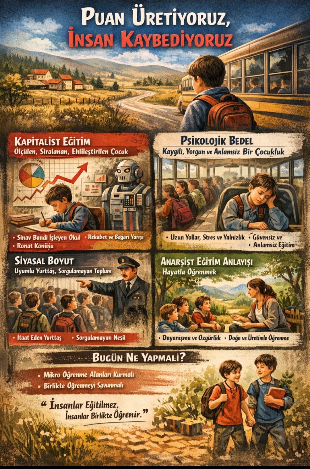 Köy okulları, tam da bu yüzden tehlikeliydi. Çünkü öğrenme; müfredattan değil, yaşamdan akıyordu. Topraktan, üretimden, sorumluluktan… Taşımalı sistemle birlikte çocuk; kendi mekânından, ritminden ve güvenli bağlamından koparıldı.