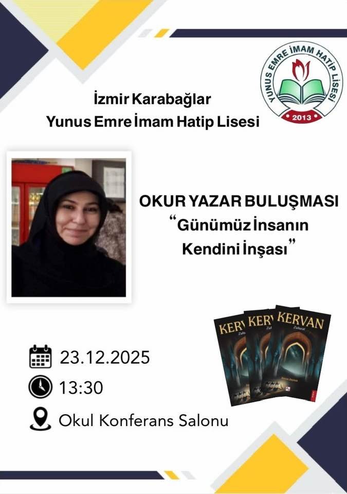 Yunus Emre İmam Hatip Lisesi’nde Okur-Yazar Buluşması Düzenleniyorİzmir Karabağlar Yunus Emre İmam Hatip Lisesi, öğrencileri edebiyat ve düşünce dünyasıyla buluşturacak anlamlı bir etkinliğe ev sahipliği yapıyor. Okul tarafından düzenlenen “Okur Yazar Buluşması”, “Günümüz İnsanın Kendini İnşası” başlığıyla gerçekleştirilecek.Etkinlik kapsamında sitemizin değerli hanımefendi yazarı Ravza Zeybek, günümüz insanının kimlik arayışı, değer dünyası ve bireysel inşa süreci üzerine öğrencilerle bir araya gelecek. Söyleşi formatında planlanan programda, edebiyatın insan ruhuna ve düşünce dünyasına katkıları ele alınacak.