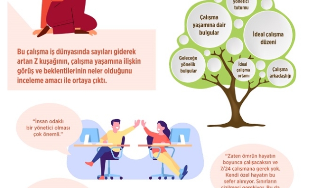 Z kuşağı çalışan ve öğrenci grubuna çalışma hayatının tanımı, ideal çalışma ortamı, çalışma arkadaşlığının anlamı, başarılı yöneticilerin özellikleri neler olmalıdır gibi iş hayatına dair görüşleri soruldu. Z kuşağı gençleri, iş hayatında en çok değer görmeyi, fikirlerinin sorulmasını ve saygı beklediklerini söylerken, iş ortamında özellikle yöneticilerinin iletişim dilinin yapıcı olmasını beklediklerini de vurguladı İş ortamındaki paylaşım ve arkadaşlıklara önem verdiklerini, bu nedenle belirli bir profesyonellik içinde kalarak iş sonrası sosyal paylaşımlarının ve birlikteliklerin faydasına inandıklarını da belirtti.